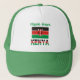 Un camionero personalizado que muestra la bandera keniana con la palabra KENYA abajo en los colores de la bandera. Arriba hay un lugar para personalizar un nombre en letras verdes. Una manera especial de honrar tu herencia. Diversión de usar para reuniones familiares, grupos de viajes y clubes. Un regalo encantador, también.