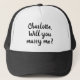 ¿Te casarás con mi personalizado de la propuesta de nombre de guión Trucker Hat Romantic lindo compromiso, propuesta de matrimonio? Texto del personalizado de guiones negros