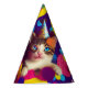 Gorras de fiesta de papel con un gatito adorable vestido con un gorra de cumpleaños en una ducha de confeti.