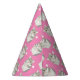 Diseño de patrones de hámster gris y blanco, con un hámster esponjoso sobre un gorra fiesta de fondo rosa brillante.