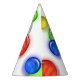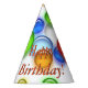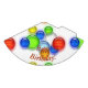 Feliz cumpleaños. El texto está escrito en naranja con una sombra negra. La imagen de fondo es una representación gráfica de múltiples burbujas de diferentes tamaños y colores diferentes (azul, verde, blanco, amarillo, rojo, naranja).