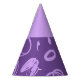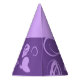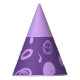 Este gorra fiesta de papel presenta un diseño divertido basado en líneas circulares, puntos artísticos y puntos de polka plana en lila sobre un fondo morado. La parte superior es del mismo color que la impresión.