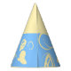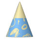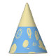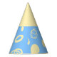 Este gorra fiesta de papel presenta un diseño divertido basado en líneas circulares, puntos artísticos y puntos de polka plana en blanco amarillento sobre un fondo azul claro. La parte superior es del mismo color que la impresión.