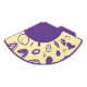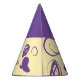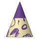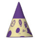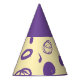 Este gorra fiesta de papel presenta un diseño divertido basado en líneas circulares, puntos artísticos y puntos de polka plana en color morado sobre un fondo blanco amarillento. La parte superior es del mismo color que la impresión.