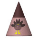 Este impresionante gorra fiesta presenta un personalizado de pavo con grandes ojos negros, un pequeño pico amarillo y plumas de cola pegadas. Los pies están en direcciones opuestas, lo que hace que el pavo parezca ridículo. El pavo tiene un texto rosado en el vientre que dice "Feliz Día de Acción de Gracias" y parece que las plumas han sido arrancadas para revelar el mensaje.