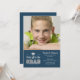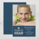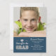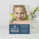 Una invitación azul y gris con las palabras "gorras apagado al graduado" y a un adorno del casquillo de la graduación.