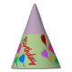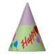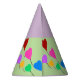gorras de la fiesta de cumpleaños de globo de bonito. Celebra un primer cumpleaños o personaliza para cualquier edad con estos festivos globos voladores de corazón en rojo, rosa, azul, lavanda, amarillo, verde con el aspecto de rociadores que delinean globos. Feliz cumpleaños escrito en texto rojo en lados de globos. Se muestra con lavanda de dos tonos y fondo verde claro. Gorras de celebración de cumpleaños divertidos para niños o adultos. Diseño original de ilustraciones gráficas © 2013, 2016 TamiraZDesigns.