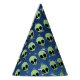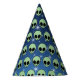Un patrón de cabeza extraterrestre verde con grandes ojos ovalados negros y una pequeña hendidura negra para una boca. El fondo es de color degradado de color oscuro a azul claro, salpicado de estrellas blancas.