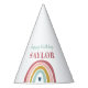 El gorra de la fiesta de cumpleaños rosado Cute Boho Rainbow Birthday presenta un adorable arcoiris en tonos rosa, rubor, mostaza, agua y marina, junto con caligrafía moderna.