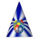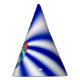Birthday Boy texto sobre globos coloridos y un fondo giratorio azul.
