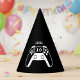 This gaming boy birthday party hat features a bold black background with a modern video game design. The dark background creates a strong and stylish gamer look that stands out at any birthday celebration. It is perfect for boys who love video games and modern party themes.