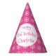 Gorras Personalizados De Papel De Aniversario De La Fiesta De Aceite De Snowflake Rosa. Un fondo divertido de copos de nieve rosa y blanco. Círculo blanco con letra rosa bonito dice Feliz cumpleaños. Personalice con edad y nombre. Fiesta de cumpleaños rosa brillante y adorable para una fiesta de cumpleaños temática invernal para niñas pequeñas.