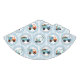 Equipamiento de construcción con un niño en mente. Rayas azules y blancas con acentos turquesa y naranja a la menta.