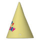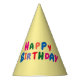 Una variedad de letras de colores forman las palabras Feliz Cumpleaños en un gorra fiesta amarillo brillante.