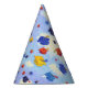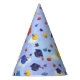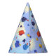 Estos gorras de la fiesta de graduación están decorados con una escena de coloridos gorros de graduación lanzados al aire, mostrados contra un cielo azul con nubes esponjosas.