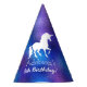 Falsos gorras púrpuras del fiesta del papel del cumpleaños de los chicas de la silueta del unicornio del Relieve metalizado. Silueta blanca bonita de un unicornio en un falso fondo púrpura y azul del efecto metalizado. Personalizado con nombre de los chicas del cumpleaños en la fuente blanca y su edad. Fuentes del fiesta del unicornio de la diversión para un cumpleaños temático del unicornio. www.SamAnnDesigns.com