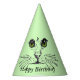 Este gorra fiesta personalizado es verde claro con un ilustracion de cara de gato con una nariz linda y bigotes largos y grandes ojos verdes brillantes. Personalizar el texto Feliz Cumpleaños con la plantilla.
