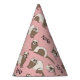 Ferretes dibujados a mano, xoxo y corazones patrón gorras de papel fiesta, fondo rosado.