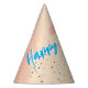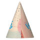 This personalized birthday cone features a vibrant and playful design, perfect for adding a pop of color to any birthday celebration. The design showcases an array of diagonal stripes in pastel pink, teal, and cream colors intersecting with dotted patterns and solid circles in complementary shades. The varied dot sizes create a dynamic texture across the surface, while the larger circles add visual interest and balance. This festive pattern is ideal for anyone looking to bring a touch of whimsy and joy to their special day.