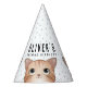 Gorra de fiesta encantadora para niños con gato adorable y confeti para una fiesta de cumpleaños muy dulce.