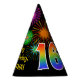 Este divertido y vibrante diseño gorra de fiesta de cumpleaños presenta un colorido patrón inspirado en los estallidos de fuegos artificiales de celebración, junto con el número "16" que tiene un espectro multicolor inspirado en el arcoiris o un patrón gradiente. También incluye un nombre de personalizable y un mensaje de evento, como un saludo de cumpleaños "Feliz". Un gorra de papel con tema de cumpleaños como este podría ser usado por los asistentes en una fiesta de cumpleaños que se lleva a cabo en celebración del 16 cumpleaños de alguien. [~Z0000333]