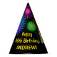 Este divertido y vibrante diseño gorra de fiesta de cumpleaños presenta un colorido patrón inspirado en los estallidos de fuegos artificiales de celebración, junto con el número "46" que presenta un espectro multicolor inspirado en el arcoiris o un patrón gradiente. También incluye un nombre de personalizable y un mensaje de evento, como un saludo de cumpleaños "Feliz". Un gorra de papel con temática de cumpleaños como este podría ser usado por los invitados en una fiesta de cumpleaños que se lleva a cabo para celebrar el cuarenta y seis cumpleaños de alguien. [~Z0000333]