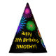 Este divertido y vibrante diseño gorra de fiesta de cumpleaños presenta un colorido patrón inspirado en los estallidos de fuegos artificiales de celebración, junto con el número "38" que presenta un multicolor como el espectro o el patrón de gradiente. También incluye un nombre de personalizable y un mensaje de evento, como un saludo de cumpleaños "Feliz". Un gorra de papel con tema de cumpleaños como este podría ser usado por los asistentes a una fiesta de cumpleaños que se lleva a cabo para celebrar el cumpleaños treinta y ocho de alguien. [~Z0000333]