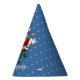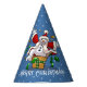 A funny snowman cartoon on paper hats for a Christmas party. Use "Personalize this template" to change the "Merry Christmas!" text and create a unique, customized item. It's maximum Christmas with this excited snowman dressed up as Santa Claus, jumping out of a Christmas present like a jack-in-the-box. The surprise gift is wrapped in gold paisley wrapping paper and a green ribbon with white snowflakes.