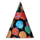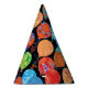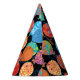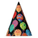 Globos festivos decorados con coloridos patrones fractales en tonos rojos, azules, naranjas, morados y verdes sobre un fondo negro, hacen de estos gorras fiestas perfectos para un cumpleaños.