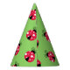 El gorra del fiesta se muestra en un diseño lindo de la impresión de las mariquitas de la verde lima y del rojo.