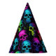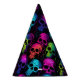 This party hat is shown in a colorful spooky Halloween skulls print.