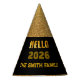 Ring in the New Year with style using this glamorous "Hello 2026" party hat! The modern design features a festive gold glitter texture effect at the top and a sleek black background at the bottom. The year "2026" and "Hello" are written in bold, coordinating gold typography. The bottom text is fully customizable, allowing you to add your family name ("The Smith Family") or a short custom message. It’s the perfect accessory for New Year's Eve countdown parties, family photos, and celebrating the arrival of 2026 together.