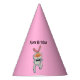 Este gorra fiesta personalizado es rosa brillante con un lindo conejo personalizado vestido con una corbata de arco negro que da un signo de aprobación. Personalizar el texto Feliz Cumpleaños con la plantilla.