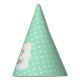 Gorras de papel en fiestas de cumpleaños de mentes mágicas y puntas de polka blanco. El diseño presenta un patrón de puntos de polka blanco sobre verde menta y una forma blanca en el medio con el texto personalizado.