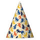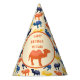 Celebra cumpleaños y otros eventos especiales con estilo con estos gorras de fiesta de papel que presentan un ilustracion de estilo personalizado de un camello bactriano o un camello con dos humps en naranja contra un fondo de arena desértica con tu propio mensaje personalizado y un patrón de camellos en tonos azules, naranjas y amarillos.