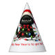 This party hat is shown with a fun cat print wrapped in christmas lights and santa hat on front. Sides show part of the cat. Greeting states in a grumpy sort of way, " Happy New Year's to you too."