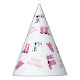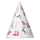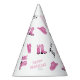 Un patrón de botas de cowgirl, gorra, texto de "Cumpleaños feliz", y "1er" impreso en vaca, conforman este gorra fiesta. El fondo es blanco.