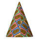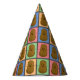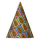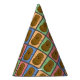 Divertidos gorras fiestas al estilo del arte pop con un patrón de rectángulos de diferentes colores cada uno con una alegre papa marrón en el medio.
