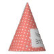 Gorras de papel de la fiesta de cumpleaños con motivos de puntos de polka blanco y rosa coral. El diseño presenta un patrón de puntos polka blancos sobre blanco y una forma blanca en el medio con el texto personalizado.