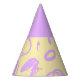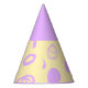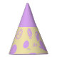 Este gorra fiesta de papel presenta un diseño divertido basado en líneas circulares, puntos artísticos y puntos de polka plana en lila sobre un fondo blanco amarillento. La parte superior es del mismo color que la impresión.