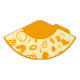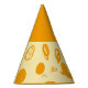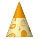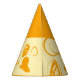 Este gorra fiesta de papel presenta un diseño divertido basado en líneas circulares, puntos artísticos y puntos de polka plana en naranja oscuro sobre un fondo blanco amarillento. La parte superior es del mismo color que la impresión.