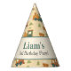 Personalized train-themed party hats for a child’s birthday celebration. Featuring your child’s name and age, these custom hats add a playful touch and make adorable accessories for little party guests.