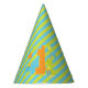 Este fiesta ofrece un gran número anaranjado uno rodeado los gorras que llevan verdes de un stegosaurus azul y de un fiesta del rex del tyrannosaurus (t-rex) y llevando a cabo un presente. Verde, azul, naranja y las estrellas del amarillo rodee el top de la imagen.