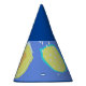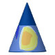 Este gorra fiesta presenta la parte superior azul oscuro, y puntos, líneas y formas abstractas en diseño naranja, amarillo, blanco y azul medio.