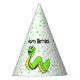 Este gorra fiesta personalizado es blanco con puentes de polka verde vibrantes y una sonriente serpiente personalizado verde y amarillo brillante. Personalizar el texto Feliz Cumpleaños con la plantilla.