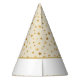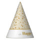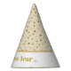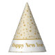 This party hat is shown in a print of fun golden stars all over, text in coordinating color states Happy New Year.