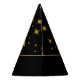 This party hat is shown in a black and gold stars print. Text in coordinating color states Happy New Year.