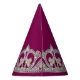 This party hat is shown in a plum wine-fuchsia color background and a silver and pearl tiara print all the way around. Text in coordinating color of silver-gray states Happy New Year.