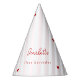 The perfect valentines day birthday party hat for your little sweetheart birthday. The PRIYA girl little sweetheart birthday party hat design has a light pink and white striped background with a wavy pink frame and red hearts topped with a red coquette bow. Script and serif fonts in red with all editable text completes this little sweetheart 1st birthday party hats for Valentine's birthday decorations.