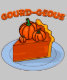 A slice of pumpkin pie is topped with small ornamental gourds, adding a playful touch. The word 'Gourd-geous' is creatively displayed above.